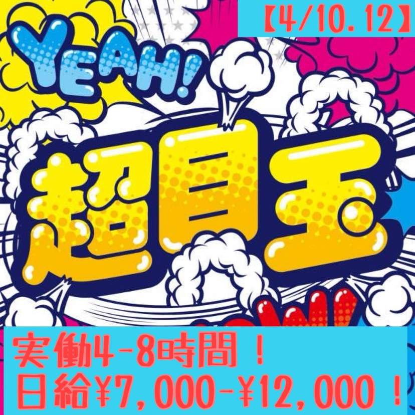 | 勤務時間 | 4/9(木) 7:00-13:00・30名 4/13(月) 8:00-17:00・30名 |