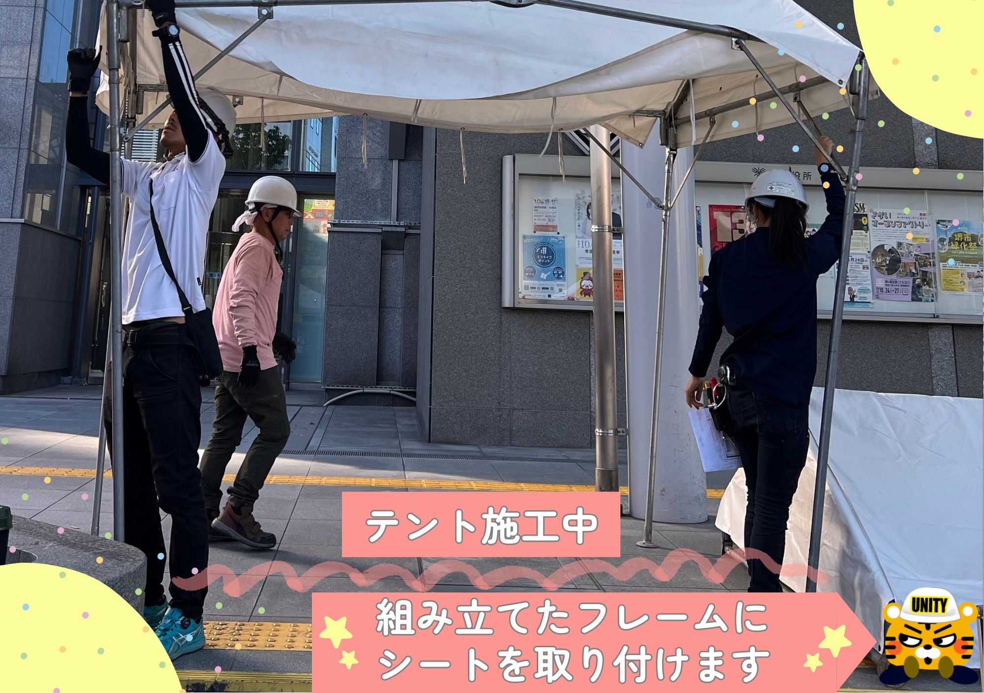 設営・撤去は複数名で進める前提。周りの動きに合わせて声をかけたり、作業をつないだりしながら進めます。
